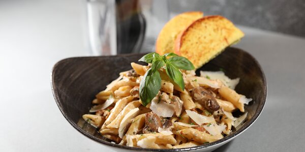 penne pasta | creamy white sauce | grilled chicken | grilled mushrooms | parmesan | garlic | parsley
