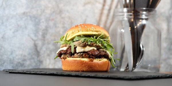 sesame beetroot vegan bun | veggie patty of your choice | mozzarella cheese | tomatoes | arugula salad | mayonnaise | grilled mushrooms | fried onions | BBQ sauce